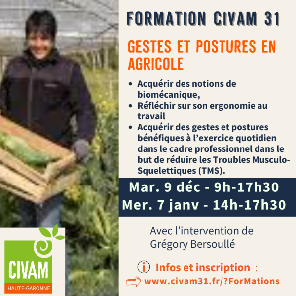 Les agricultrices sont confrontées de par leur activité professionnelle à des pressions sur leur corps. Cette formation permet l'acquisition de gestes et postures bénéfiques à l'exercice quotidien pour réduire les Troubles Musculo-Squelettiques (TMS).